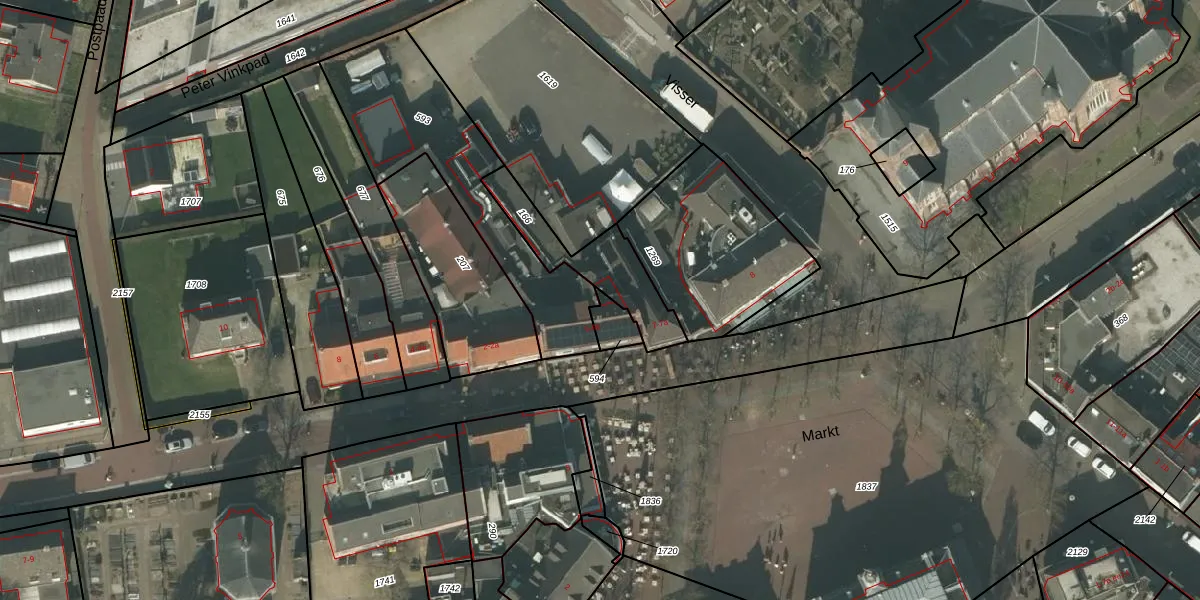 Het perceel waarop Markt 6-c staat heeft een oppervlakte van 54 m². Dit is een klein perceel. De perceeloppervlakte wordt geregistreerd door het Kadaster. Gedetailleerde informatie over de maten van dit perceel kunt u vinden in het rapport Kadastrale kaart met maatvoering van Markt 6-c.