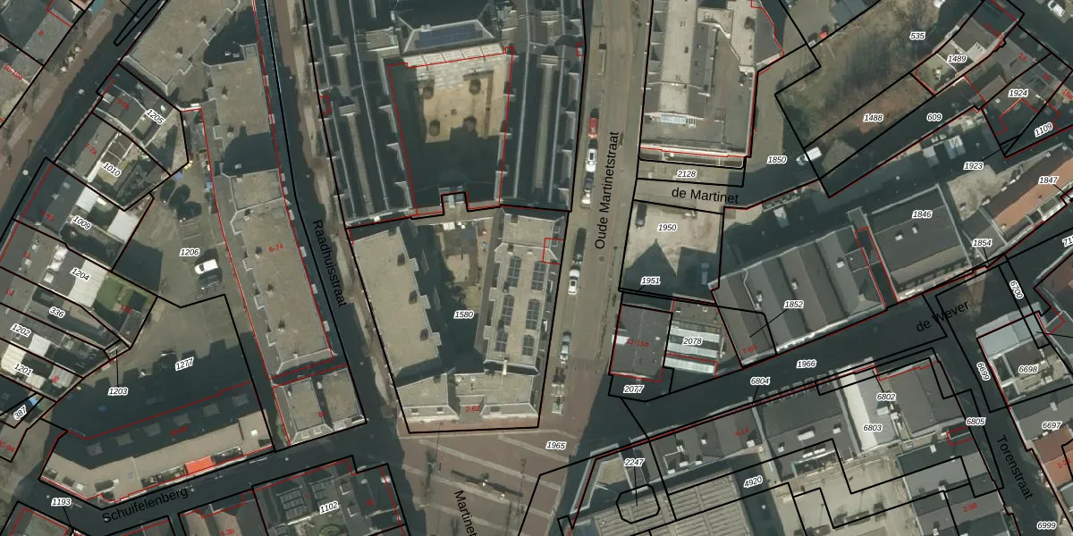 Het perceel waarop Martinetplein 54 staat heeft een oppervlakte van 1350 m². Dit is een zeer groot perceel. De perceeloppervlakte wordt geregistreerd door het Kadaster. Gedetailleerde informatie over de maten van dit perceel kunt u vinden in het rapport Kadastrale kaart met maatvoering van Martinetplein 54.
