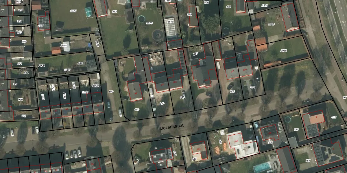 Het perceel waarop Mozartstraat 103 staat heeft een oppervlakte van 448 m². Dit is een groot perceel. De perceeloppervlakte wordt geregistreerd door het Kadaster. Gedetailleerde informatie over de maten van dit perceel kunt u vinden in het rapport Kadastrale kaart met maatvoering van Mozartstraat 103.