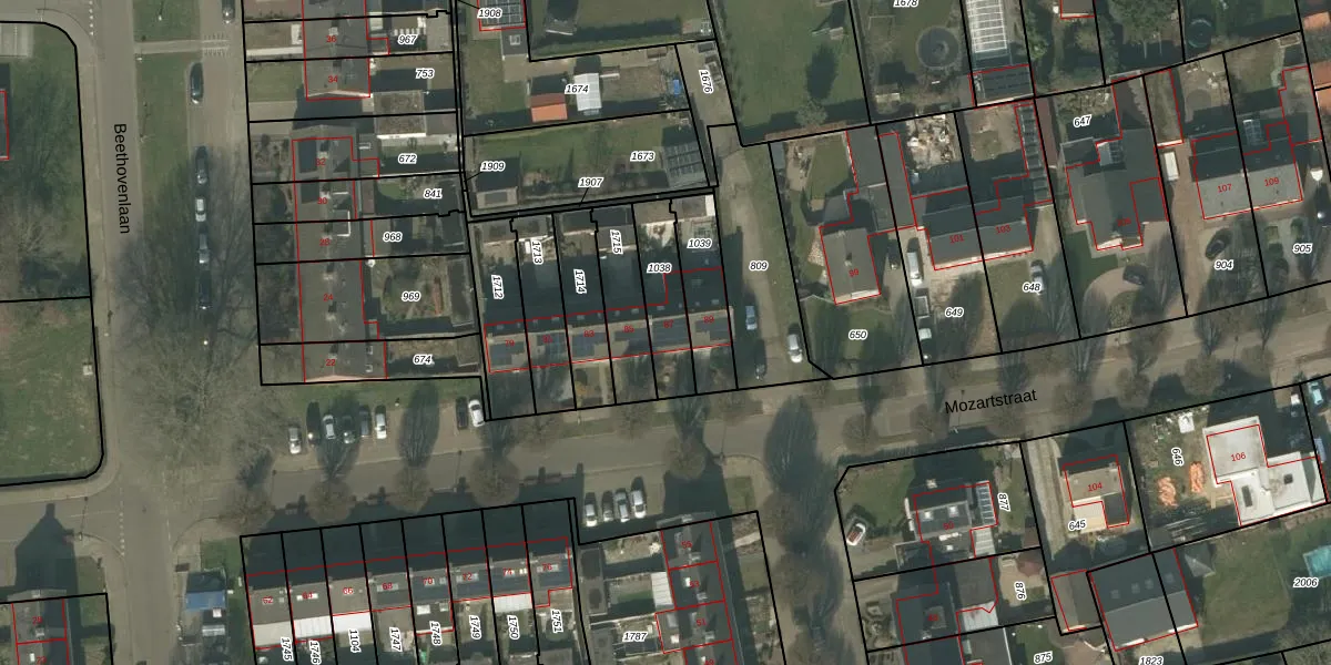 Het perceel waarop Mozartstraat 87 staat heeft een oppervlakte van 182 m². Dit is een middelgroot perceel. De perceeloppervlakte wordt geregistreerd door het Kadaster. Gedetailleerde informatie over de maten van dit perceel kunt u vinden in het rapport Kadastrale kaart met maatvoering van Mozartstraat 87.