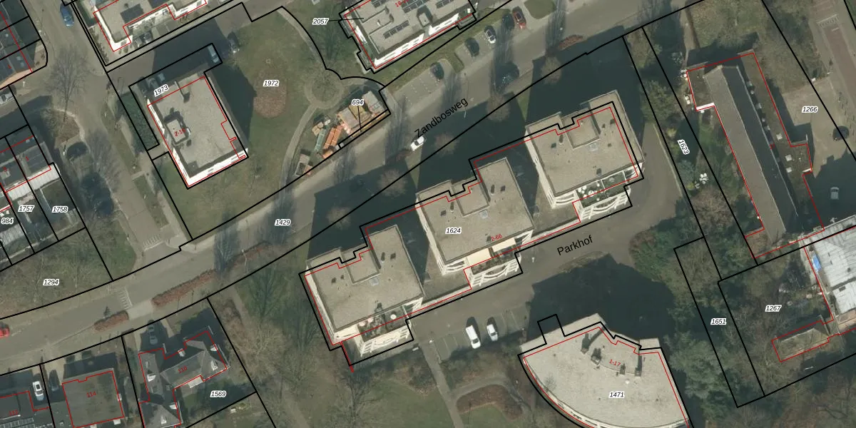 Het perceel waarop Parkhof 34 staat heeft een oppervlakte van 1980 m². Dit is een zeer groot perceel. De perceeloppervlakte wordt geregistreerd door het Kadaster. Gedetailleerde informatie over de maten van dit perceel kunt u vinden in het rapport Kadastrale kaart met maatvoering van Parkhof 34.