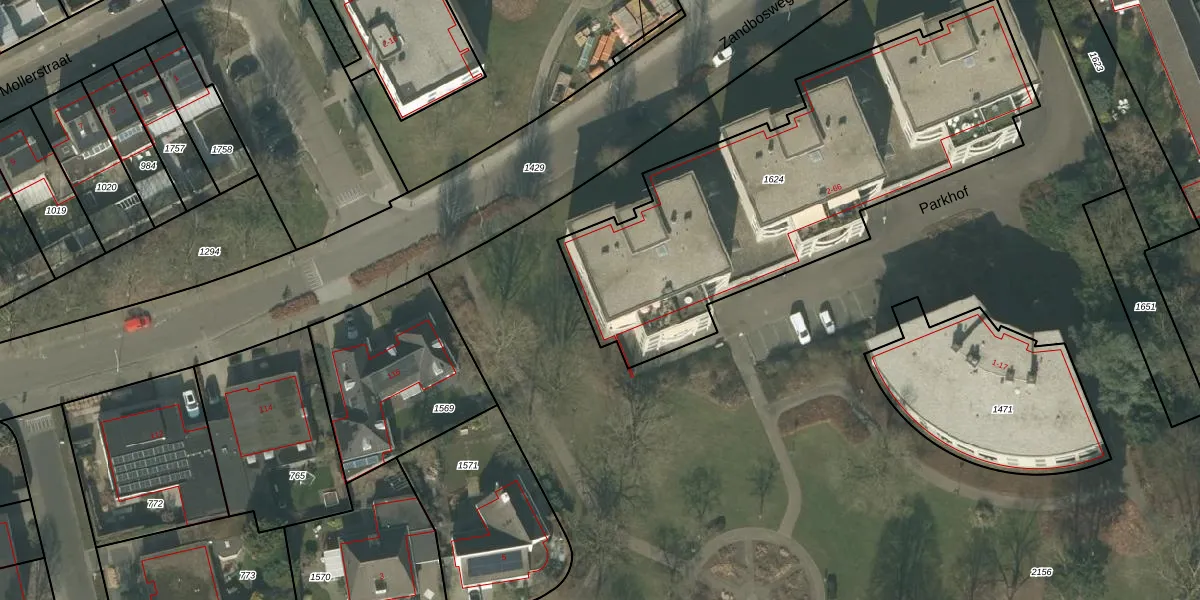 Het perceel waarop Parkhof 56 staat heeft een oppervlakte van 1980 m². Dit is een zeer groot perceel. De perceeloppervlakte wordt geregistreerd door het Kadaster. Gedetailleerde informatie over de maten van dit perceel kunt u vinden in het rapport Kadastrale kaart met maatvoering van Parkhof 56.