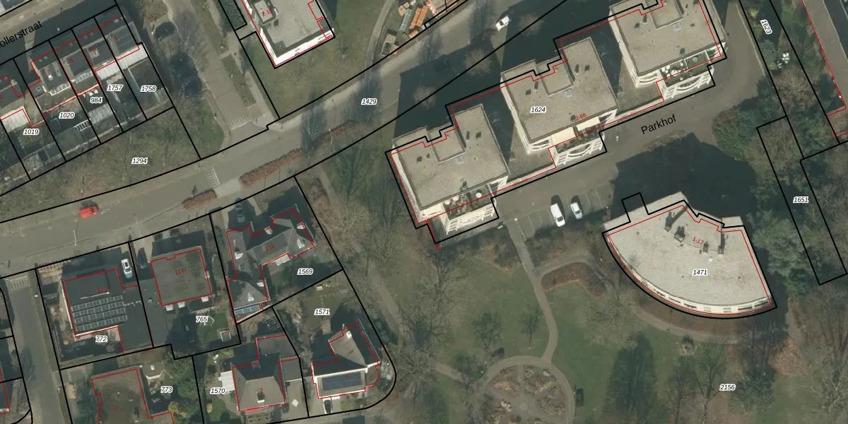 Het perceel waarop Parkhof 60 staat heeft een oppervlakte van 1980 m². Dit is een zeer groot perceel. De perceeloppervlakte wordt geregistreerd door het Kadaster. Gedetailleerde informatie over de maten van dit perceel kunt u vinden in het rapport Kadastrale kaart met maatvoering van Parkhof 60.