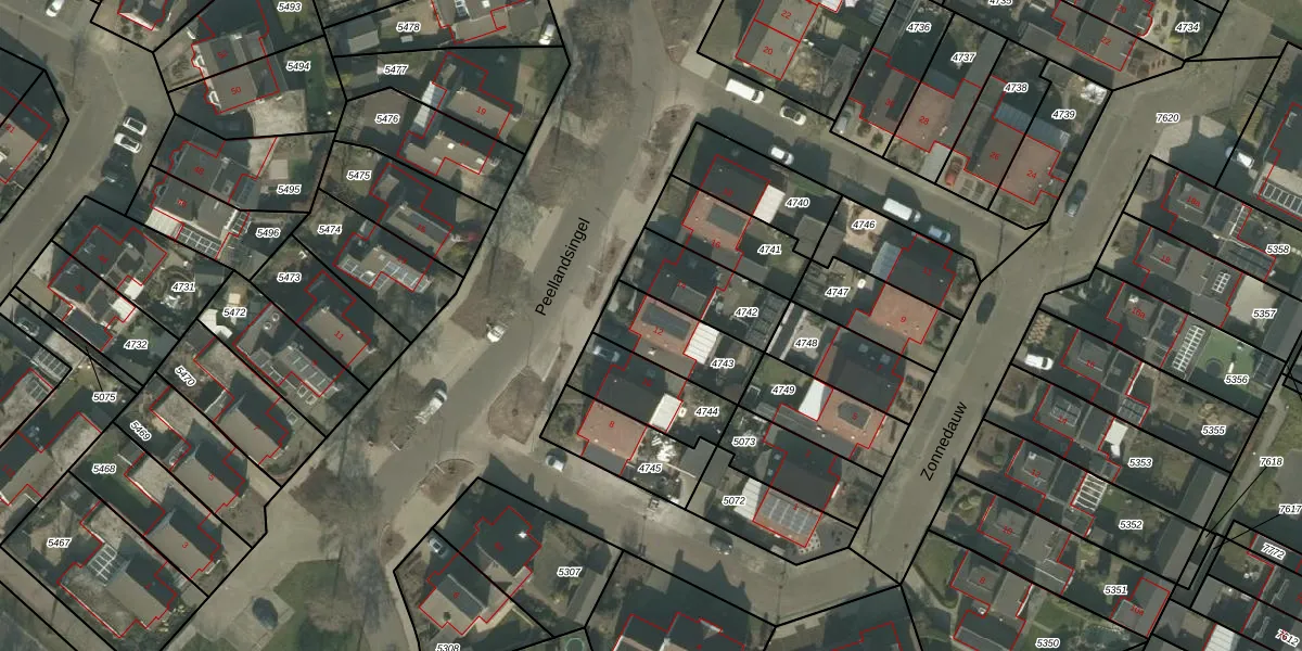 Peellandsingel 12 is gelegen op kadastraal perceel DNE00L4743. Deze kadastrale aanduiding is uniek en wordt gebruikt door het Kadaster om eigendomsrechten en andere zakelijke rechten vast te leggen. Het perceel maakt onderdeel uit van de kadastrale gemeente Deurne.