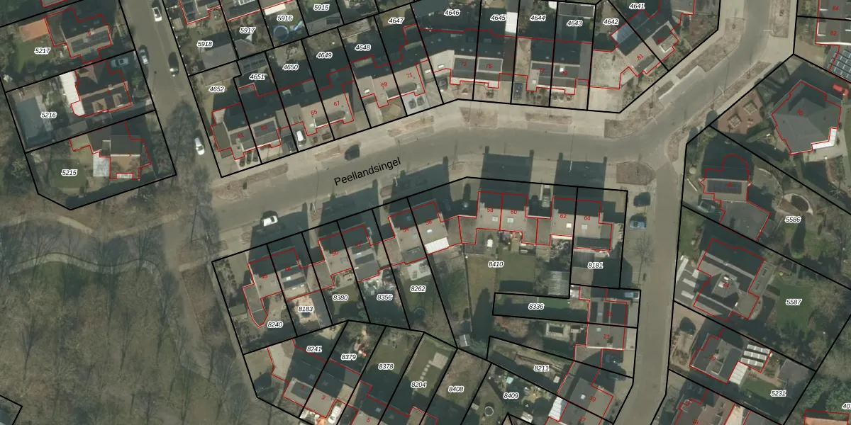 Peellandsingel 56 is gelegen op kadastraal perceel DNE00L8410. Deze kadastrale aanduiding is uniek en wordt gebruikt door het Kadaster om eigendomsrechten en andere zakelijke rechten vast te leggen. Het perceel maakt onderdeel uit van de kadastrale gemeente Deurne.