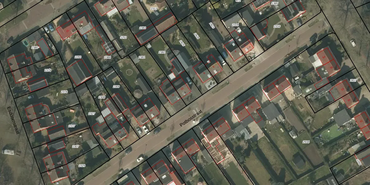 Het perceel waarop Potbosstraat 10 staat heeft een oppervlakte van 413 m². Dit is een groot perceel. De perceeloppervlakte wordt geregistreerd door het Kadaster. Gedetailleerde informatie over de maten van dit perceel kunt u vinden in het rapport Kadastrale kaart met maatvoering van Potbosstraat 10.