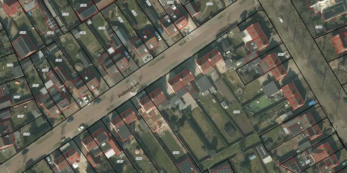 Het perceel waarop Potbosstraat 7 staat heeft een oppervlakte van 6955 m². Dit is een zeer groot perceel. De perceeloppervlakte wordt geregistreerd door het Kadaster. Gedetailleerde informatie over de maten van dit perceel kunt u vinden in het rapport Kadastrale kaart met maatvoering van Potbosstraat 7.