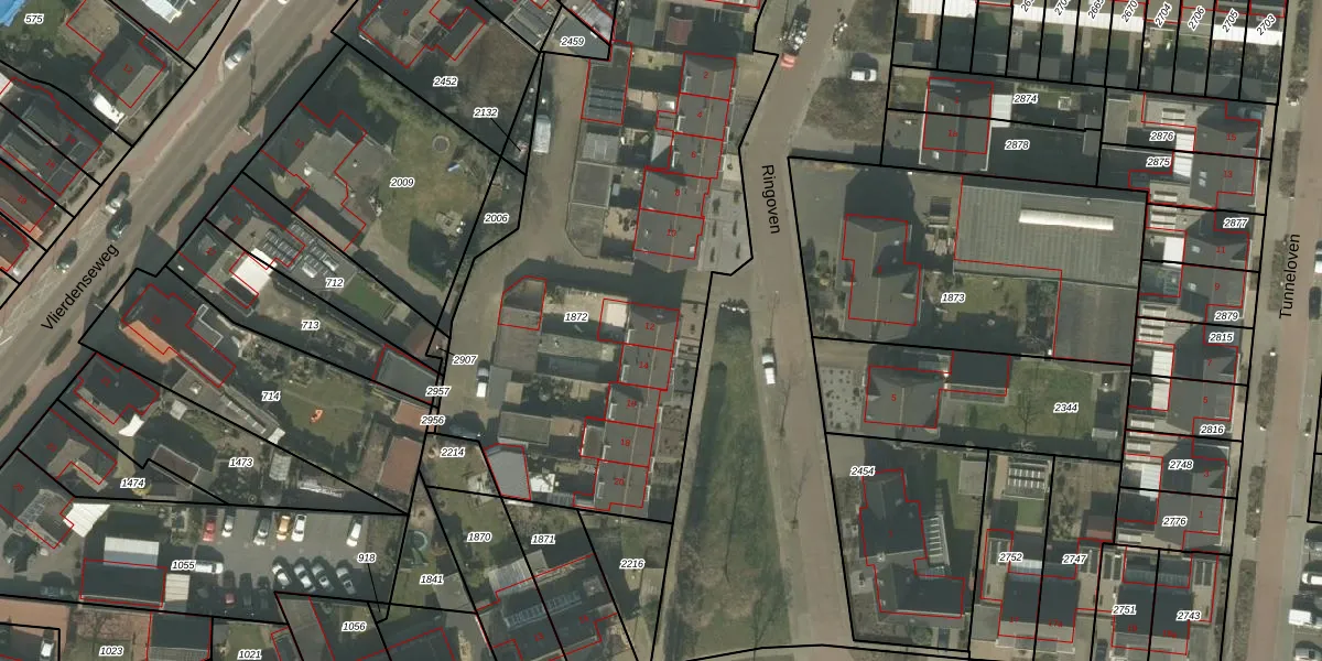 Het perceel waarop Ringoven 12 staat heeft een oppervlakte van 2910 m². Dit is een zeer groot perceel. De perceeloppervlakte wordt geregistreerd door het Kadaster. Gedetailleerde informatie over de maten van dit perceel kunt u vinden in het rapport Kadastrale kaart met maatvoering van Ringoven 12.