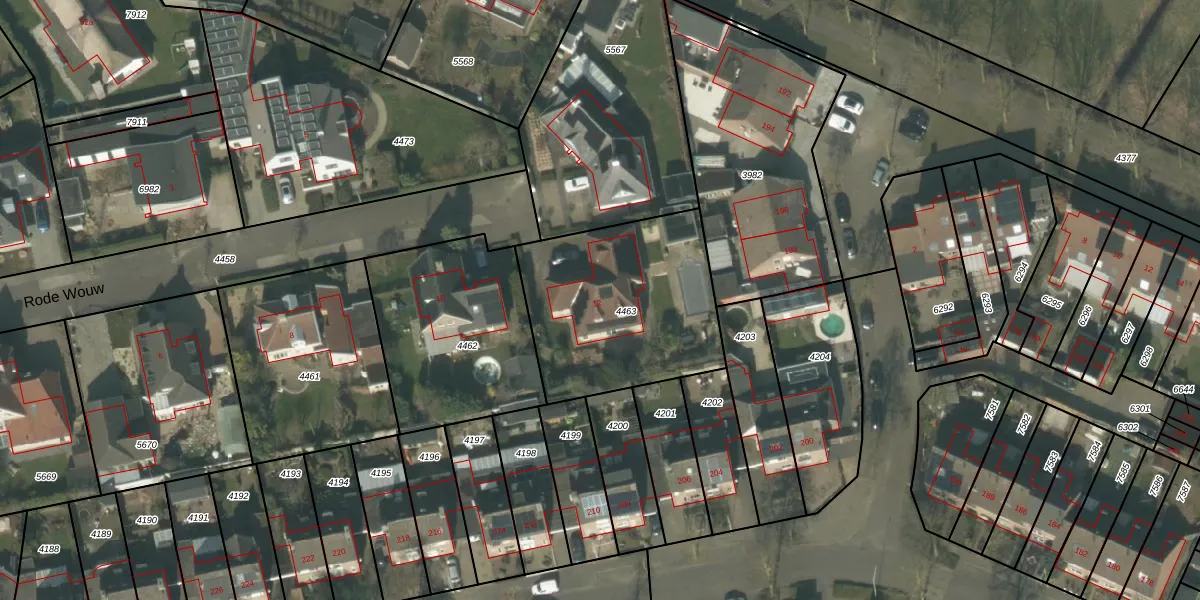 Rode Wouw 12 is gelegen op kadastraal perceel DNE00L4463. Deze kadastrale aanduiding is uniek en wordt gebruikt door het Kadaster om eigendomsrechten en andere zakelijke rechten vast te leggen. Het perceel maakt onderdeel uit van de kadastrale gemeente Deurne.