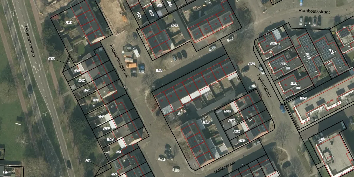 Het perceel waarop Romboutsstraat 19 staat heeft een oppervlakte van 1895 m². Dit is een zeer groot perceel. De perceeloppervlakte wordt geregistreerd door het Kadaster. Gedetailleerde informatie over de maten van dit perceel kunt u vinden in het rapport Kadastrale kaart met maatvoering van Romboutsstraat 19.