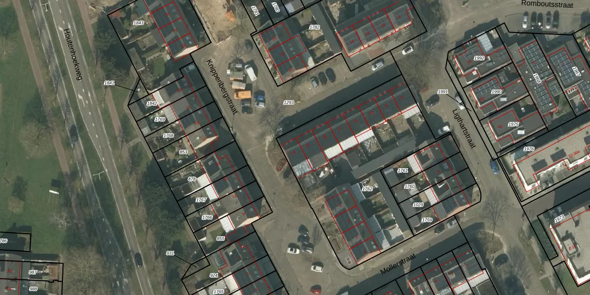 Het perceel waarop Romboutsstraat 23 staat heeft een oppervlakte van 1895 m². Dit is een zeer groot perceel. De perceeloppervlakte wordt geregistreerd door het Kadaster. Gedetailleerde informatie over de maten van dit perceel kunt u vinden in het rapport Kadastrale kaart met maatvoering van Romboutsstraat 23.