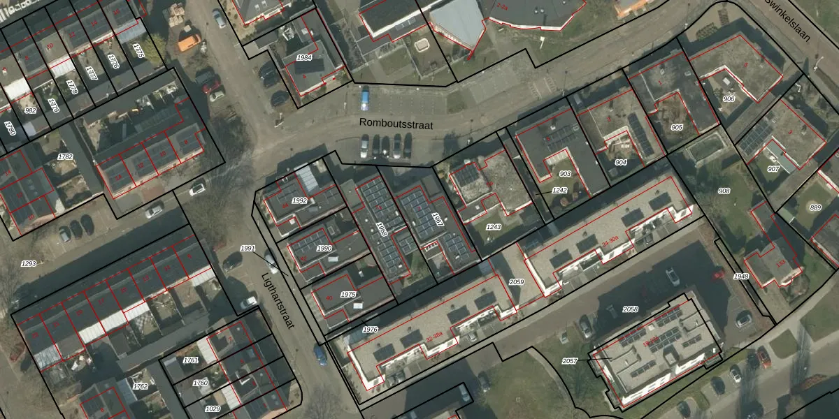 Het perceel waarop Romboutsstraat 7 staat heeft een oppervlakte van 340 m². Dit is een groot perceel. De perceeloppervlakte wordt geregistreerd door het Kadaster. Gedetailleerde informatie over de maten van dit perceel kunt u vinden in het rapport Kadastrale kaart met maatvoering van Romboutsstraat 7.