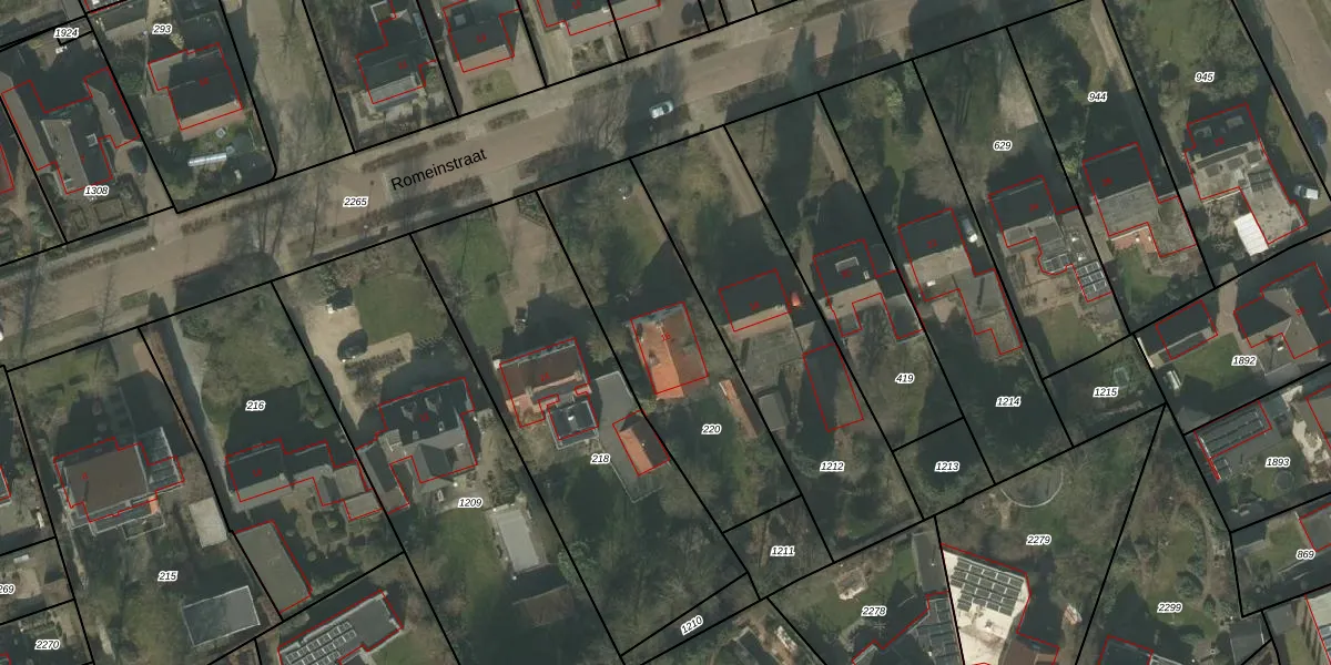 Romeinstraat 16 is gelegen op kadastraal perceel DNE00N220. Deze kadastrale aanduiding is uniek en wordt gebruikt door het Kadaster om eigendomsrechten en andere zakelijke rechten vast te leggen. Het perceel maakt onderdeel uit van de kadastrale gemeente Deurne.