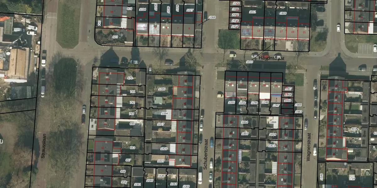 Het perceel waarop Schubertstraat 21 staat heeft een oppervlakte van 525 m². Dit is een groot perceel. De perceeloppervlakte wordt geregistreerd door het Kadaster. Gedetailleerde informatie over de maten van dit perceel kunt u vinden in het rapport Kadastrale kaart met maatvoering van Schubertstraat 21.