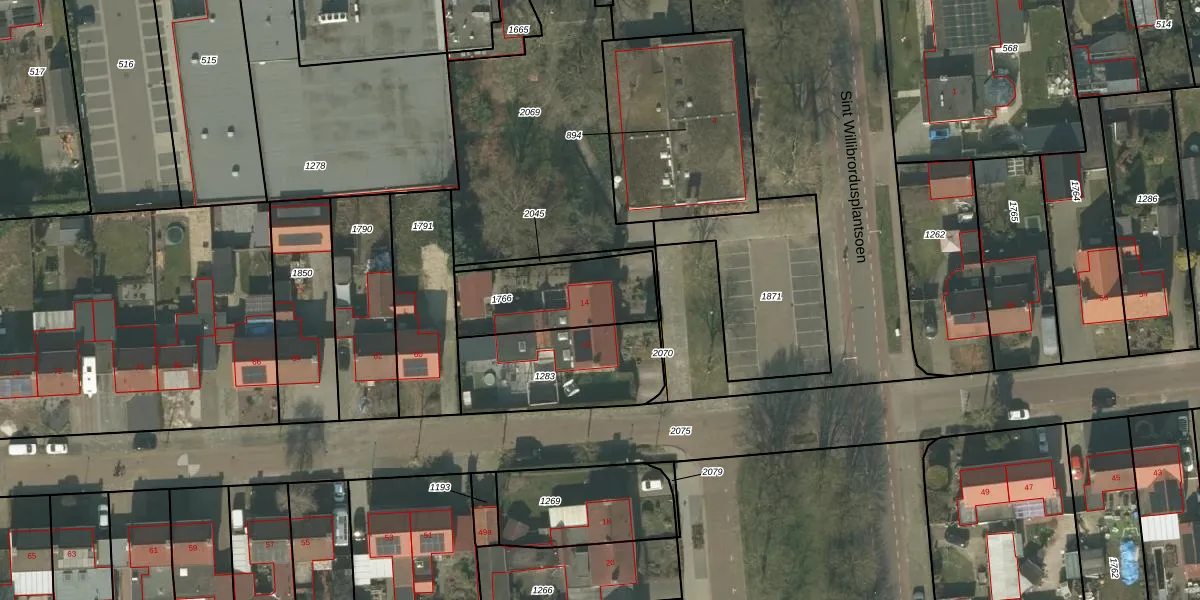 Het perceel waarop Sint Willibrordusplantsoen 14 staat heeft een oppervlakte van 371 m². Dit is een groot perceel. De perceeloppervlakte wordt geregistreerd door het Kadaster. Gedetailleerde informatie over de maten van dit perceel kunt u vinden in het rapport Kadastrale kaart met maatvoering van Sint Willibrordusplantsoen 14.