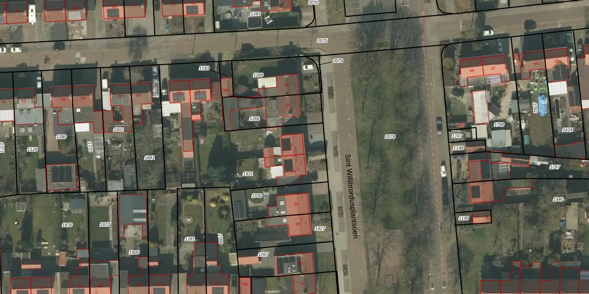 Het perceel waarop Sint Willibrordusplantsoen 22 staat heeft een oppervlakte van 2016 m². Dit is een zeer groot perceel. De perceeloppervlakte wordt geregistreerd door het Kadaster. Gedetailleerde informatie over de maten van dit perceel kunt u vinden in het rapport Kadastrale kaart met maatvoering van Sint Willibrordusplantsoen 22.