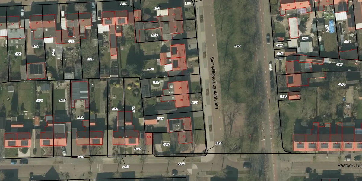 Het perceel waarop Sint Willibrordusplantsoen 26 staat heeft een oppervlakte van 345 m². Dit is een groot perceel. De perceeloppervlakte wordt geregistreerd door het Kadaster. Gedetailleerde informatie over de maten van dit perceel kunt u vinden in het rapport Kadastrale kaart met maatvoering van Sint Willibrordusplantsoen 26.
