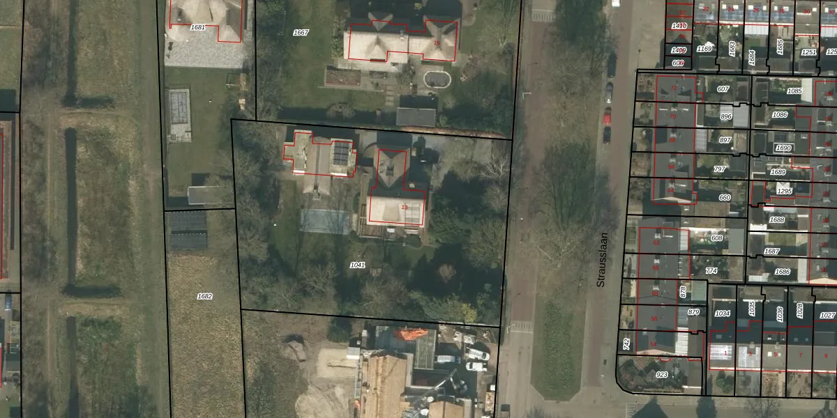 Het perceel waarop Strausslaan 13 staat heeft een oppervlakte van 2900 m². Dit is een zeer groot perceel. De perceeloppervlakte wordt geregistreerd door het Kadaster. Gedetailleerde informatie over de maten van dit perceel kunt u vinden in het rapport Kadastrale kaart met maatvoering van Strausslaan 13.
