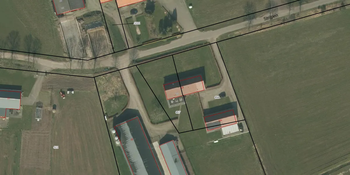 Strijpen 13 is gelegen op kadastraal perceel DNE00V857. Deze kadastrale aanduiding is uniek en wordt gebruikt door het Kadaster om eigendomsrechten en andere zakelijke rechten vast te leggen. Het perceel maakt onderdeel uit van de kadastrale gemeente Deurne.