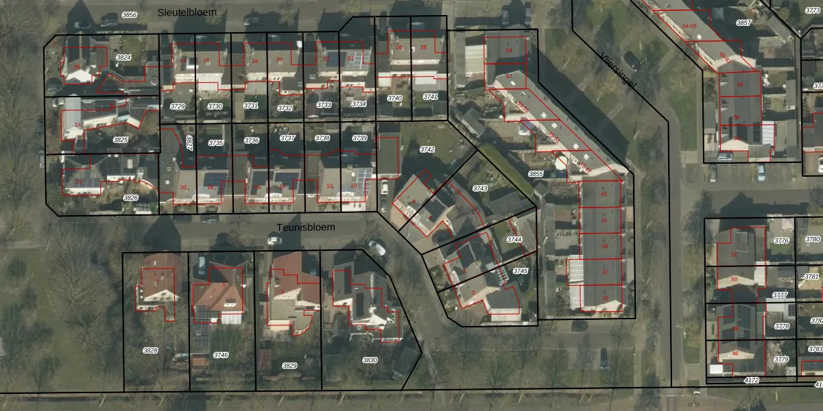 Het perceel waarop Teunisbloem 8 staat heeft een oppervlakte van 431 m². Dit is een groot perceel. De perceeloppervlakte wordt geregistreerd door het Kadaster. Gedetailleerde informatie over de maten van dit perceel kunt u vinden in het rapport Kadastrale kaart met maatvoering van Teunisbloem 8.