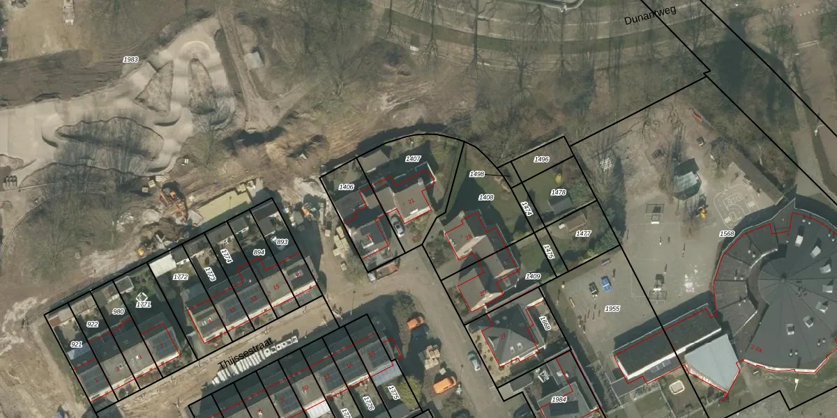 Thijssestraat 21 is gelegen op kadastraal perceel DNE00K1407. Deze kadastrale aanduiding is uniek en wordt gebruikt door het Kadaster om eigendomsrechten en andere zakelijke rechten vast te leggen. Het perceel maakt onderdeel uit van de kadastrale gemeente Deurne.