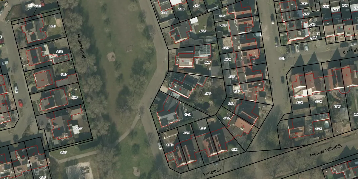 Het perceel waarop Torteltuin 39 staat heeft een oppervlakte van 595 m². Dit is een groot perceel. De perceeloppervlakte wordt geregistreerd door het Kadaster. Gedetailleerde informatie over de maten van dit perceel kunt u vinden in het rapport Kadastrale kaart met maatvoering van Torteltuin 39.