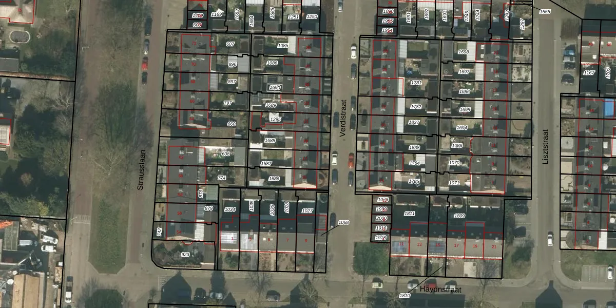 Het perceel waarop Verdistraat 17 staat heeft een oppervlakte van 161 m². Dit is een middelgroot perceel. De perceeloppervlakte wordt geregistreerd door het Kadaster. Gedetailleerde informatie over de maten van dit perceel kunt u vinden in het rapport Kadastrale kaart met maatvoering van Verdistraat 17.