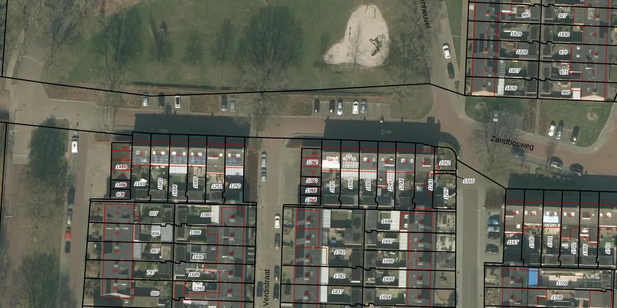 Het perceel waarop Verdistraat 40 staat heeft een oppervlakte van 60 m². Dit is een klein perceel. De perceeloppervlakte wordt geregistreerd door het Kadaster. Gedetailleerde informatie over de maten van dit perceel kunt u vinden in het rapport Kadastrale kaart met maatvoering van Verdistraat 40.