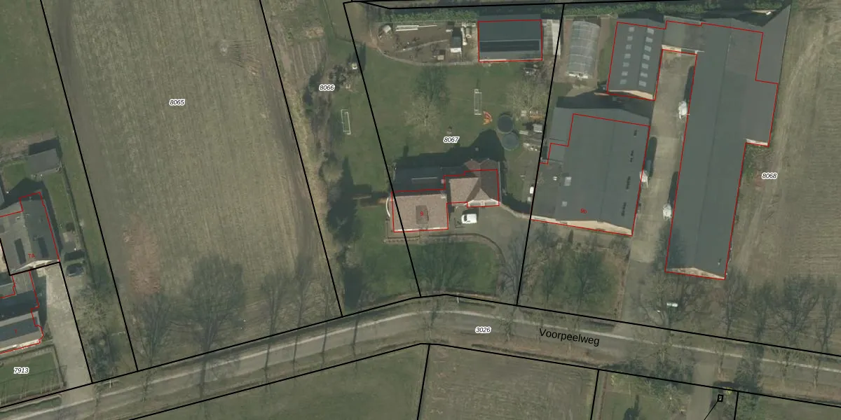 Het perceel waarop Voorpeelweg 9 staat heeft een oppervlakte van 2630 m². Dit is een zeer groot perceel. De perceeloppervlakte wordt geregistreerd door het Kadaster. Gedetailleerde informatie over de maten van dit perceel kunt u vinden in het rapport Kadastrale kaart met maatvoering van Voorpeelweg 9.