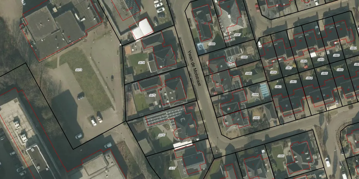 Het perceel waarop Ywan de Molstraat 9 staat heeft een oppervlakte van 773 m². Dit is een groot perceel. De perceeloppervlakte wordt geregistreerd door het Kadaster. Gedetailleerde informatie over de maten van dit perceel kunt u vinden in het rapport Kadastrale kaart met maatvoering van Ywan de Molstraat 9.