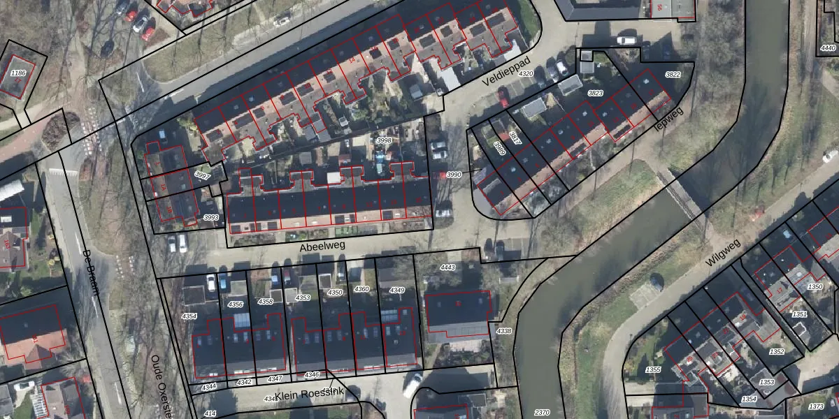 Het perceel waarop Abeelweg 15 staat heeft een oppervlakte van 3215 m². Dit is een zeer groot perceel. De perceeloppervlakte wordt geregistreerd door het Kadaster. Gedetailleerde informatie over de maten van dit perceel kunt u vinden in het rapport Kadastrale kaart met maatvoering van Abeelweg 15.
