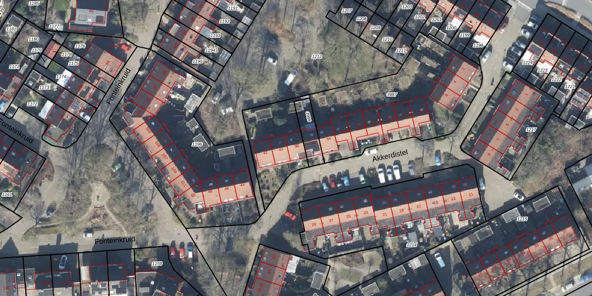 Het perceel waarop Akkerdistel 38 staat heeft een oppervlakte van 1909 m². Dit is een zeer groot perceel. De perceeloppervlakte wordt geregistreerd door het Kadaster. Gedetailleerde informatie over de maten van dit perceel kunt u vinden in het rapport Kadastrale kaart met maatvoering van Akkerdistel 38.