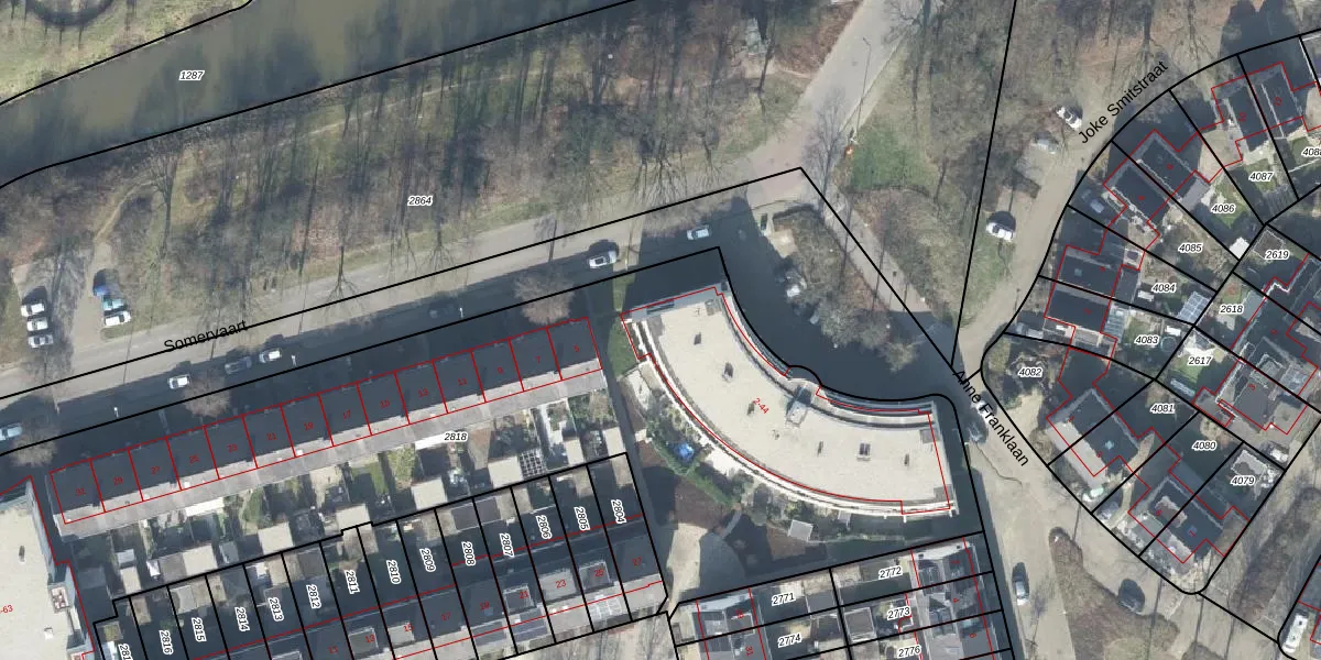 Het perceel waarop Anne Franklaan 44 staat heeft een oppervlakte van 5423 m². Dit is een zeer groot perceel. De perceeloppervlakte wordt geregistreerd door het Kadaster. Gedetailleerde informatie over de maten van dit perceel kunt u vinden in het rapport Kadastrale kaart met maatvoering van Anne Franklaan 44.