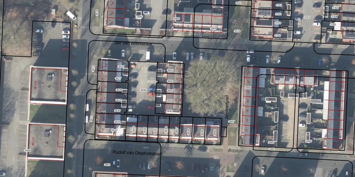 Het perceel waarop Ansfriedpad 1-B staat heeft een oppervlakte van 86 m². Dit is een klein perceel. De perceeloppervlakte wordt geregistreerd door het Kadaster. Gedetailleerde informatie over de maten van dit perceel kunt u vinden in het rapport Kadastrale kaart met maatvoering van Ansfriedpad 1-B.