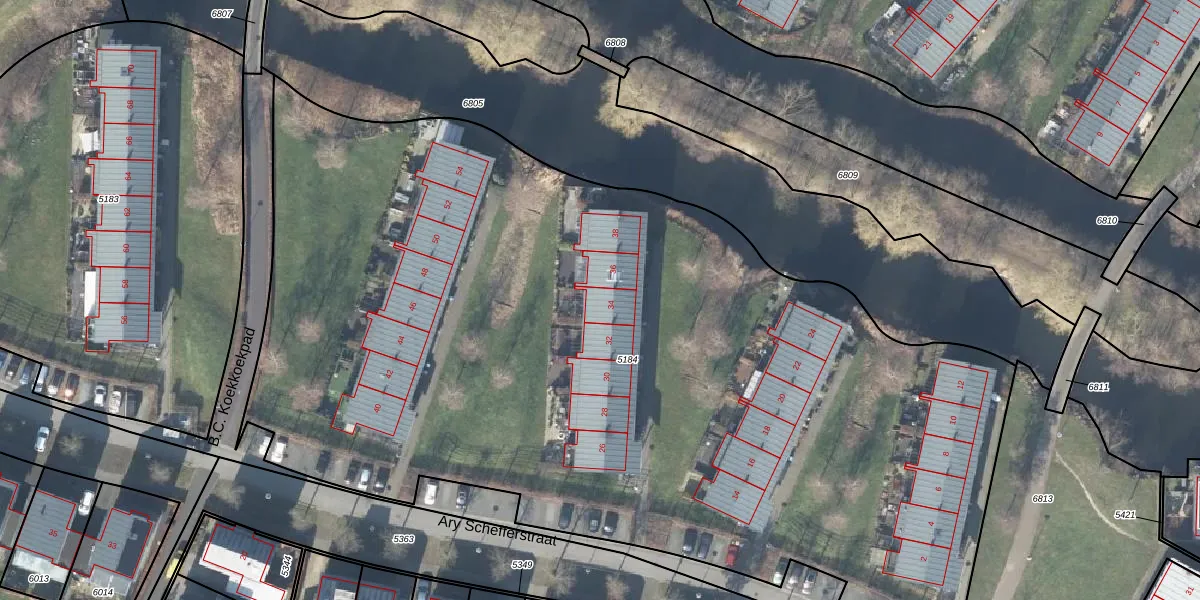 Het perceel waarop Ary Schefferstraat 34 staat heeft een oppervlakte van 6850 m². Dit is een zeer groot perceel. De perceeloppervlakte wordt geregistreerd door het Kadaster. Gedetailleerde informatie over de maten van dit perceel kunt u vinden in het rapport Kadastrale kaart met maatvoering van Ary Schefferstraat 34.