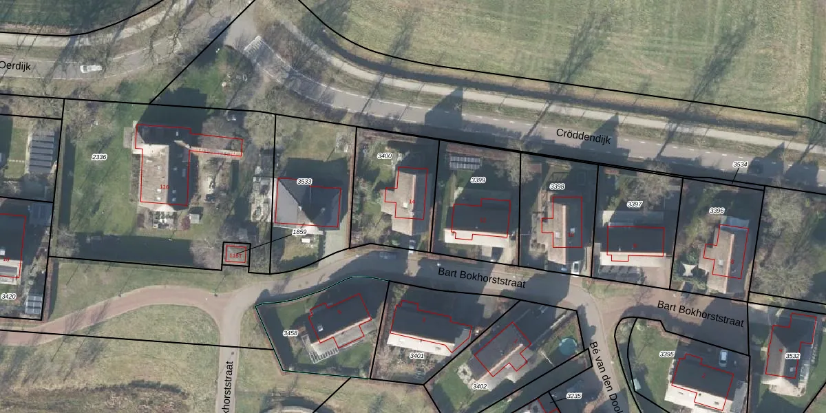 Het perceel waarop Bart Bokhorststraat 14 staat heeft een oppervlakte van 549 m². Dit is een groot perceel. De perceeloppervlakte wordt geregistreerd door het Kadaster. Gedetailleerde informatie over de maten van dit perceel kunt u vinden in het rapport Kadastrale kaart met maatvoering van Bart Bokhorststraat 14.