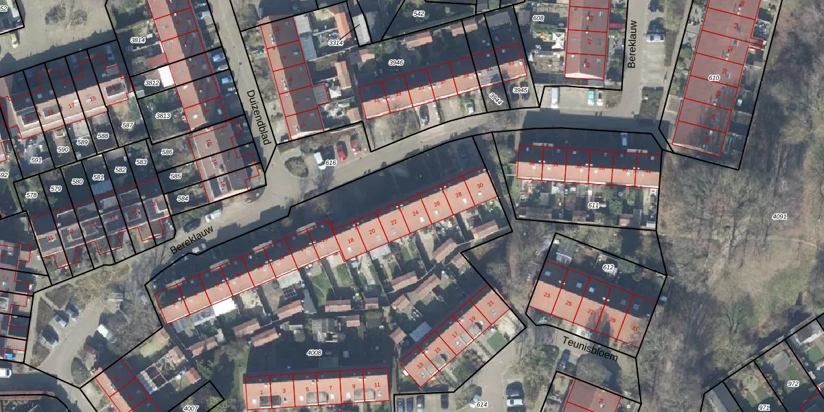 Het perceel waarop Bereklauw 24 staat heeft een oppervlakte van 4603 m². Dit is een zeer groot perceel. De perceeloppervlakte wordt geregistreerd door het Kadaster. Gedetailleerde informatie over de maten van dit perceel kunt u vinden in het rapport Kadastrale kaart met maatvoering van Bereklauw 24.