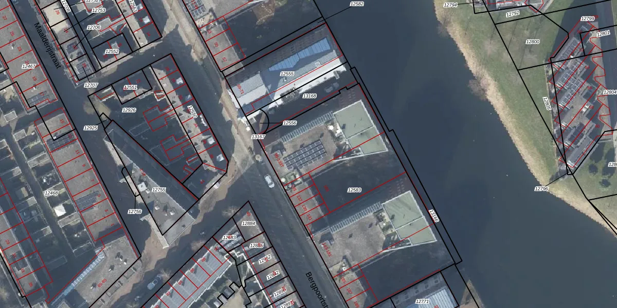 Het perceel waarop Bergpoortstraat 121 staat heeft een oppervlakte van 2464 m². Dit is een zeer groot perceel. De perceeloppervlakte wordt geregistreerd door het Kadaster. Gedetailleerde informatie over de maten van dit perceel kunt u vinden in het rapport Kadastrale kaart met maatvoering van Bergpoortstraat 121.