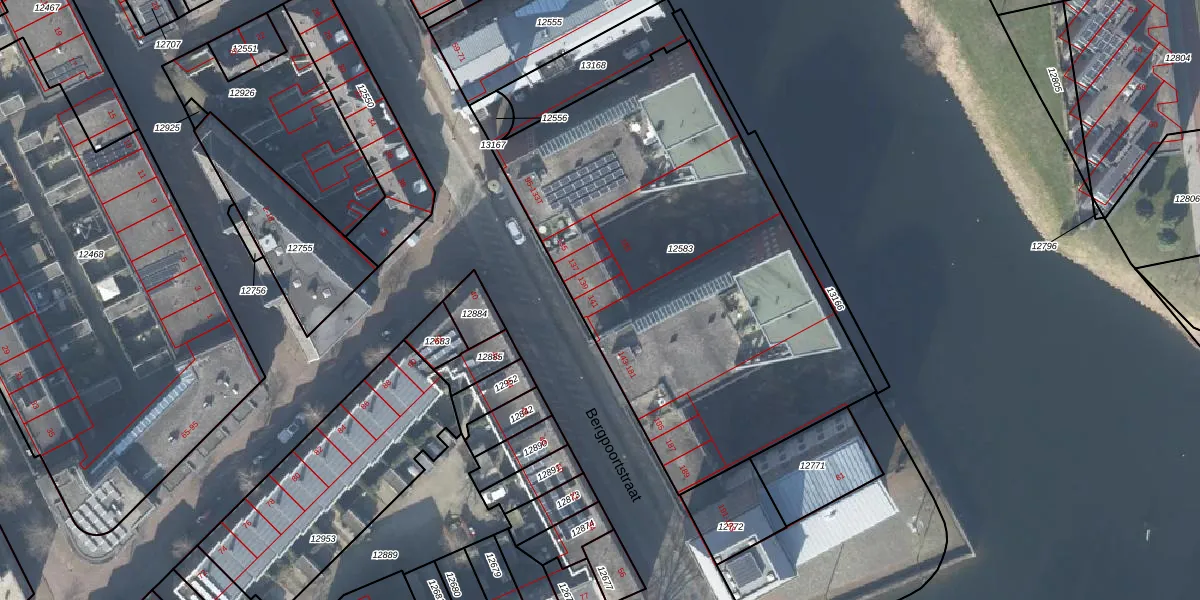 Het perceel waarop Bergpoortstraat 141 staat heeft een oppervlakte van 2464 m². Dit is een zeer groot perceel. De perceeloppervlakte wordt geregistreerd door het Kadaster. Gedetailleerde informatie over de maten van dit perceel kunt u vinden in het rapport Kadastrale kaart met maatvoering van Bergpoortstraat 141.