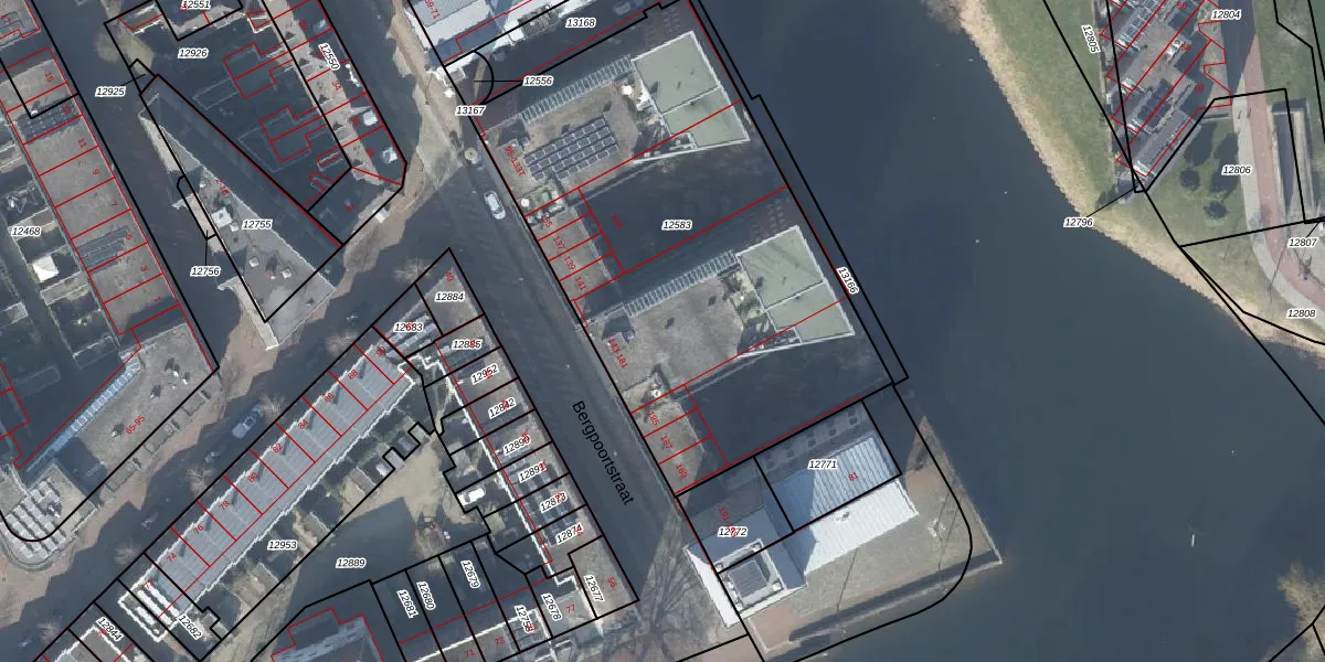 Het perceel waarop Bergpoortstraat 169 staat heeft een oppervlakte van 2464 m². Dit is een zeer groot perceel. De perceeloppervlakte wordt geregistreerd door het Kadaster. Gedetailleerde informatie over de maten van dit perceel kunt u vinden in het rapport Kadastrale kaart met maatvoering van Bergpoortstraat 169.