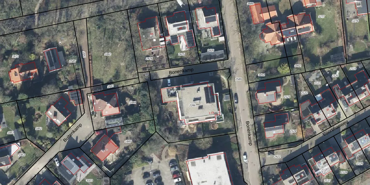 Het perceel waarop Bonenkamp 3 staat heeft een oppervlakte van 1520 m². Dit is een zeer groot perceel. De perceeloppervlakte wordt geregistreerd door het Kadaster. Gedetailleerde informatie over de maten van dit perceel kunt u vinden in het rapport Kadastrale kaart met maatvoering van Bonenkamp 3.