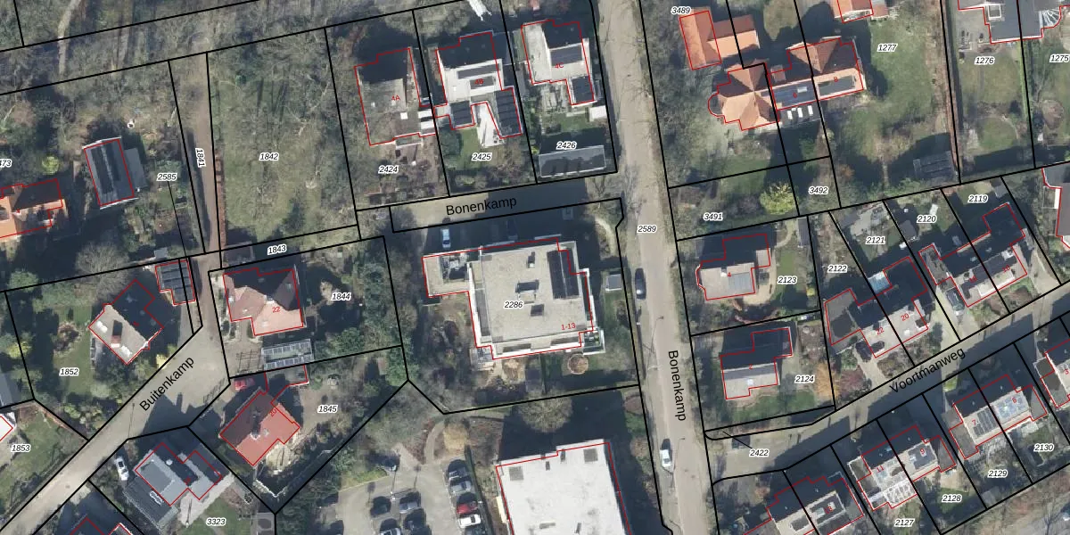 Het perceel waarop Bonenkamp 5 staat heeft een oppervlakte van 1520 m². Dit is een zeer groot perceel. De perceeloppervlakte wordt geregistreerd door het Kadaster. Gedetailleerde informatie over de maten van dit perceel kunt u vinden in het rapport Kadastrale kaart met maatvoering van Bonenkamp 5.