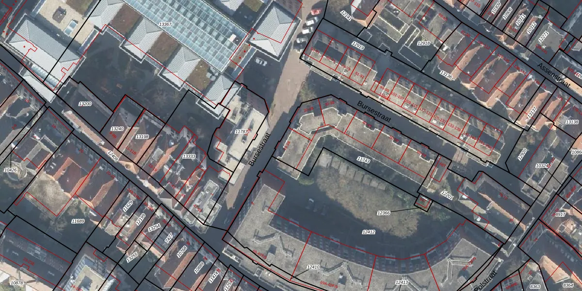 Het perceel waarop Bursestraat 14 staat heeft een oppervlakte van 960 m². Dit is een groot perceel. De perceeloppervlakte wordt geregistreerd door het Kadaster. Gedetailleerde informatie over de maten van dit perceel kunt u vinden in het rapport Kadastrale kaart met maatvoering van Bursestraat 14.