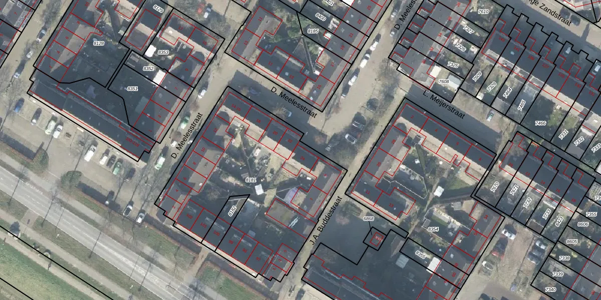 Het perceel waarop D. Meelesstraat 24 staat heeft een oppervlakte van 2222 m². Dit is een zeer groot perceel. De perceeloppervlakte wordt geregistreerd door het Kadaster. Gedetailleerde informatie over de maten van dit perceel kunt u vinden in het rapport Kadastrale kaart met maatvoering van D. Meelesstraat 24.