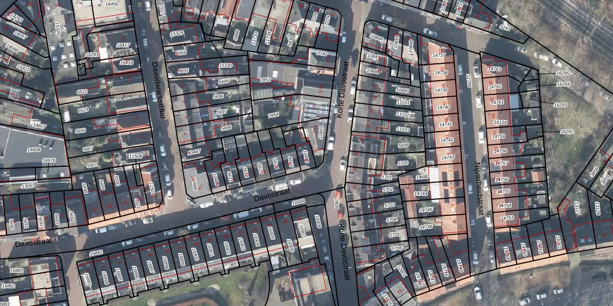 Het perceel waarop Davostraat 41 staat heeft een oppervlakte van 76 m². Dit is een klein perceel. De perceeloppervlakte wordt geregistreerd door het Kadaster. Gedetailleerde informatie over de maten van dit perceel kunt u vinden in het rapport Kadastrale kaart met maatvoering van Davostraat 41.