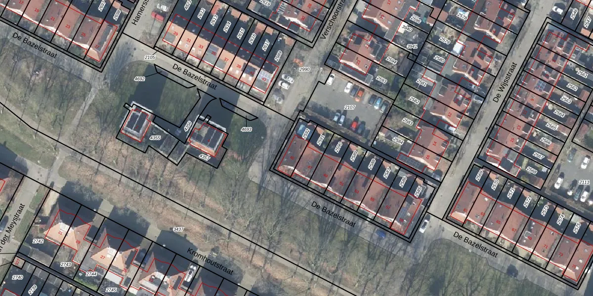 Het perceel waarop De Bazelstraat 45 staat heeft een oppervlakte van 126 m². Dit is een middelgroot perceel. De perceeloppervlakte wordt geregistreerd door het Kadaster. Gedetailleerde informatie over de maten van dit perceel kunt u vinden in het rapport Kadastrale kaart met maatvoering van De Bazelstraat 45.