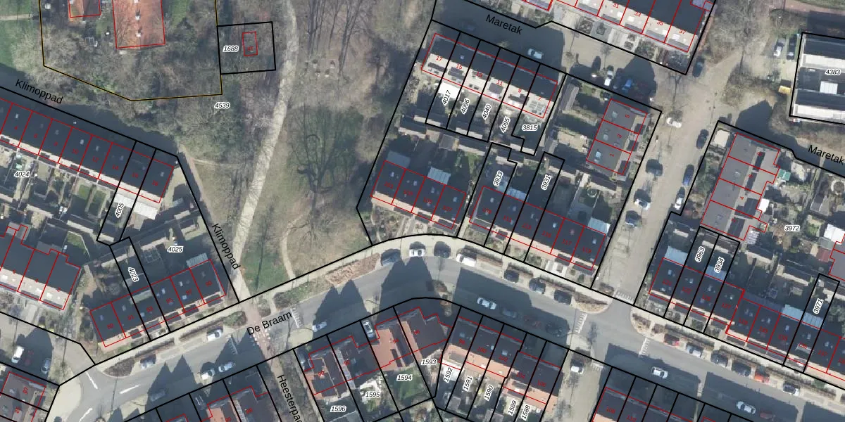 Het perceel waarop De Braam 105 staat heeft een oppervlakte van 1995 m². Dit is een zeer groot perceel. De perceeloppervlakte wordt geregistreerd door het Kadaster. Gedetailleerde informatie over de maten van dit perceel kunt u vinden in het rapport Kadastrale kaart met maatvoering van De Braam 105.