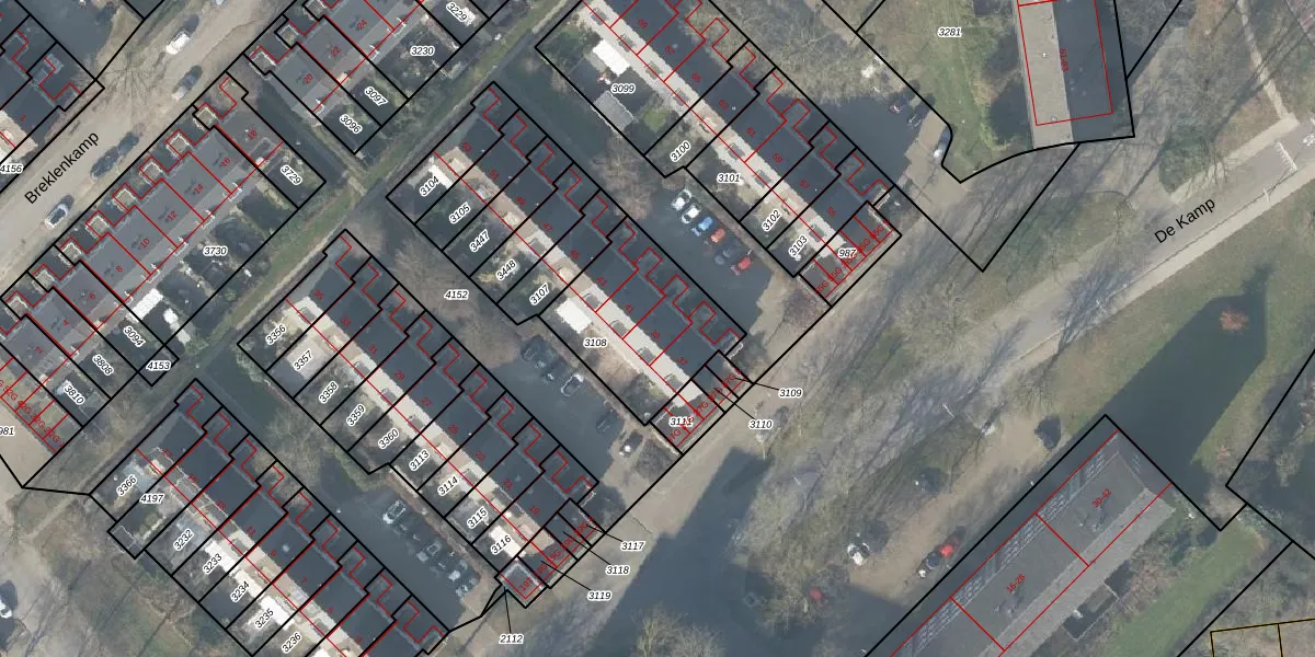Het perceel waarop De Kamp 39 staat heeft een oppervlakte van 496 m². Dit is een groot perceel. De perceeloppervlakte wordt geregistreerd door het Kadaster. Gedetailleerde informatie over de maten van dit perceel kunt u vinden in het rapport Kadastrale kaart met maatvoering van De Kamp 39.