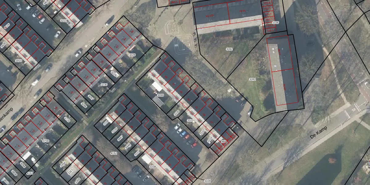Het perceel waarop De Kamp 65 staat heeft een oppervlakte van 560 m². Dit is een groot perceel. De perceeloppervlakte wordt geregistreerd door het Kadaster. Gedetailleerde informatie over de maten van dit perceel kunt u vinden in het rapport Kadastrale kaart met maatvoering van De Kamp 65.