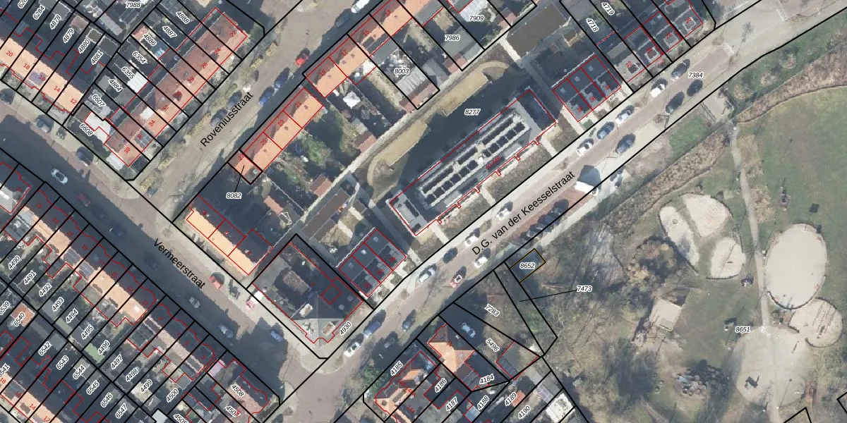 Het perceel waarop D.G. van der Keesselstraat 44-A staat heeft een oppervlakte van 4166 m². Dit is een zeer groot perceel. De perceeloppervlakte wordt geregistreerd door het Kadaster. Gedetailleerde informatie over de maten van dit perceel kunt u vinden in het rapport Kadastrale kaart met maatvoering van D.G. van der Keesselstraat 44-A.